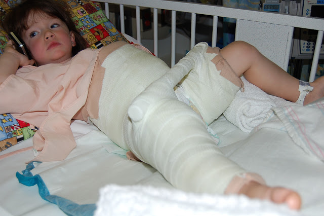 Her nurses have said she is one of the most amazing patients they have ever had. They can't believe how smart and intelligent Emma is for her age. They also can't believe her high tolerance for pain., so that goes to show how much pain she must have been having the night before when her leg was broken. Her screams were unbelieveable! They said with the injury she has and the age she is, most of their patients are given pain meds every 30 minuets. Emma was going about 6 hours in between doses. This was after her leg was set though. When they have to do something that she knows will make her hurt, the tears start flowing and she says nooooo, but will do or let them do what they have too. They have to keep checking her circulation and watch for any swelling. She is always afraid when they have to take her blood pressure and temperature. She also won't let them take her temp under her arm either. Big girls do it by mouth don't ya know. They just get the biggest kick out of her. They have all fallen in love with her. Her nurses have been so wonderful and soft and gentle with her. They are so amazed at how strong she is and tries to be even when she knows it's going to hurt. We're having trouble getting her to eat and she's not even drinking much which is really odd for her as she normally is drinking something all the time. She is hopefully going home today (Thursday), but last night before I left she started spiking a fever, plus she needs to eat more, so we'll see. Hopefully tomorrow she will feel a bit better to make the cut to go home. Keeping our fingers crossed. We are thankful that she is now on the mend, lets just hope it will be sooner than later for her sake. This is going to be really tough on her, because Miss Emma was one very active busy little girl!